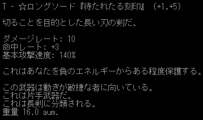 衰弱耐性のつくロングソード。こいつを装備するなら例のクロスボウを身につけた方がマシだろう。耐性を2つ得られるアーティファクトが見つからない。