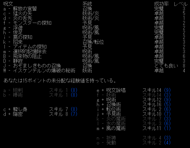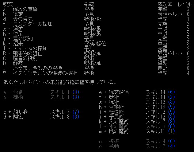 当時の僕「騒音の投射は最深階のエルフに役に立つそうだ。記憶をしようぜ。あれ?並んでいる呪文に違和感を覚えますね。もしかして選択的記憶除去を忘れている!?無意識のうちに『Zmy』を押してしまったあ!(選択的記憶除去はmだった)。mを押すとスキル画面を確認できるから、キャプチャのため『Z*』の後に押す変な癖がついていたのだ」