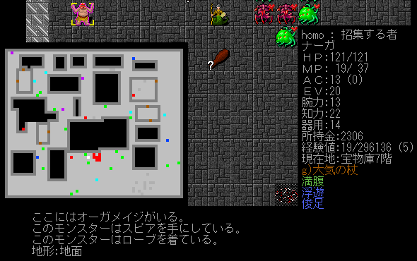 いつの間にかオーガメイジが湧いて出ていた。もう地下7階の敵は倒し尽くしたのにな。静寂を唱える必要なないだろう。浮遊をしているから追放をくらっても大した被害は出ないからね。上位ボルトを撃たれる危険はあるけど保全の護符があるし多少はね?
