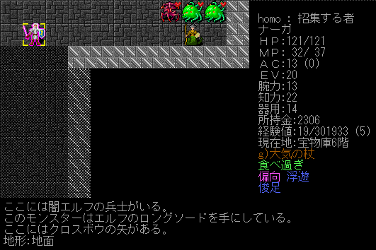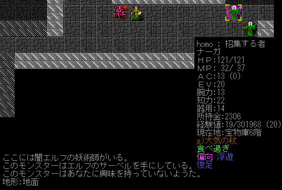 地下6階へ戻るとエルフ達が徘徊をしていた。これは経験値を稼ぐチャンスだなあ・・・いや、召換魔法を使われたら危険だ。静寂を唱えて慎重に倒す。