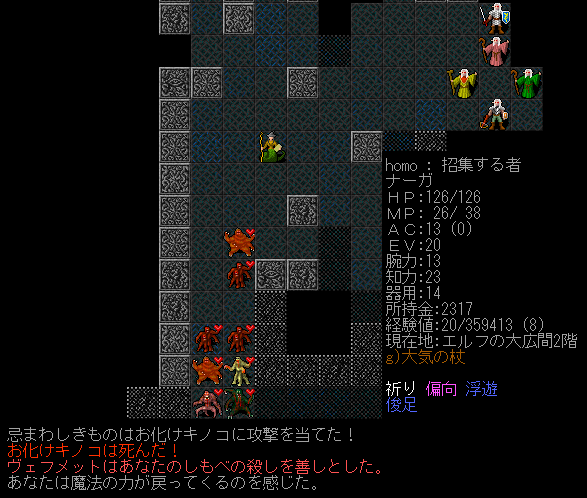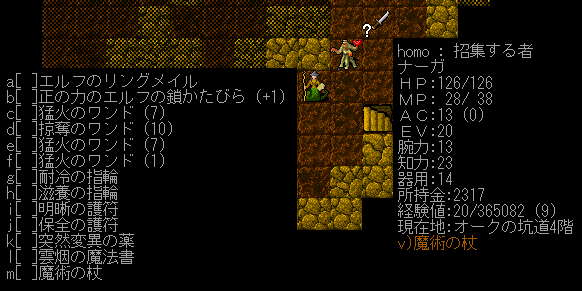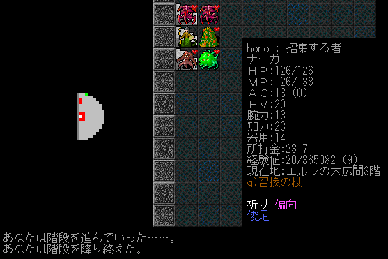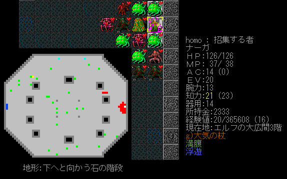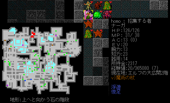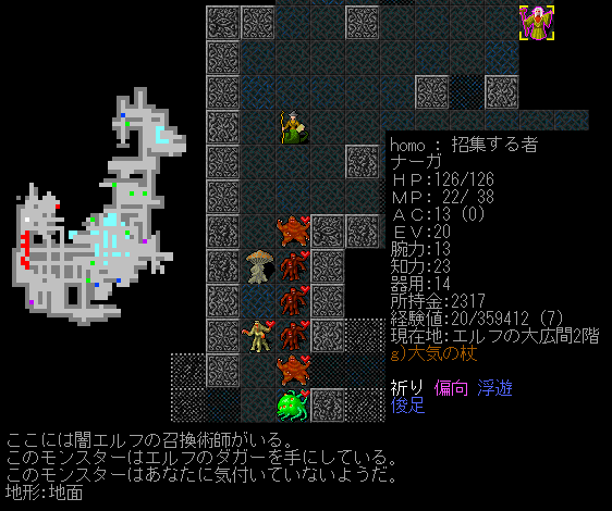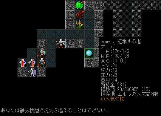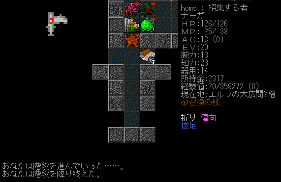 Dungeon Crawlのプレイ日記を始めます。ナーガ召換術師をプレイ中です。エルフの大広間の1階を制圧しました。アイテムがかさばってきたから諸宗派の寺院へ戻ろうか。