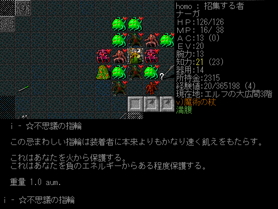 空腹の指輪がベースのアーティファクト?速く飢えちゃうのは困るが耐火と衰弱耐性が着くのは嬉しいですよね。今では普通に耐火の指輪を装備すれば良いと考えを改めている。