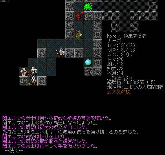 闇エルフの召換術師を発見。どうやらこちらに気づいていないようですね。こういう状況が理想なんだよな。1階とは違い探知の魔法を使っていないのが理由なのかね。つーか、罠探知を唱え忘れているのはまずいだろう。