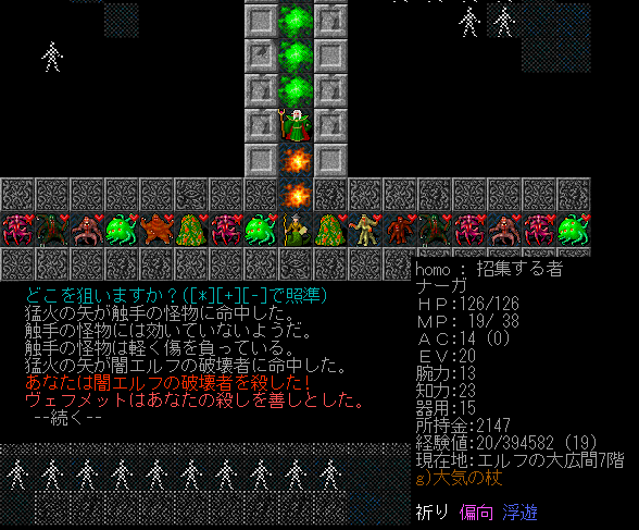 闇エルフの破壊者はエルフ達のボスらしい。静寂中だからワンドを振ることにする。上の方にいるエルフの破壊者は静寂の範囲外だから危険な行為だった。