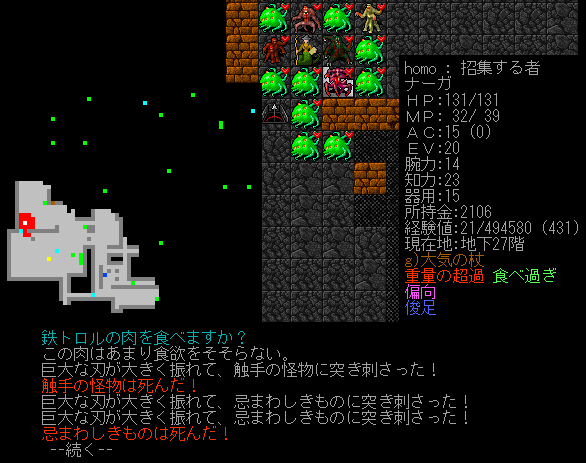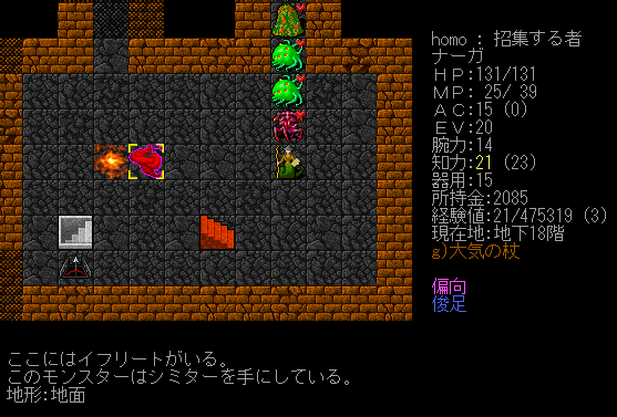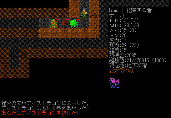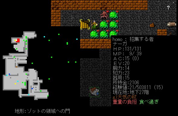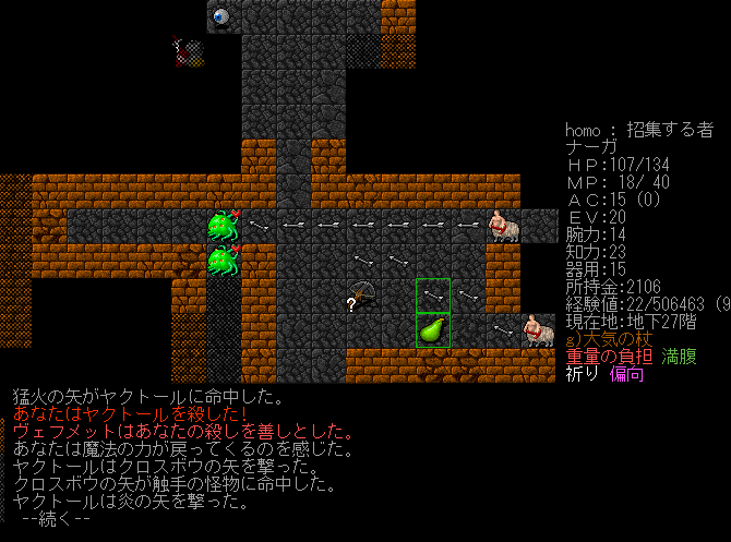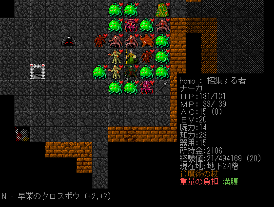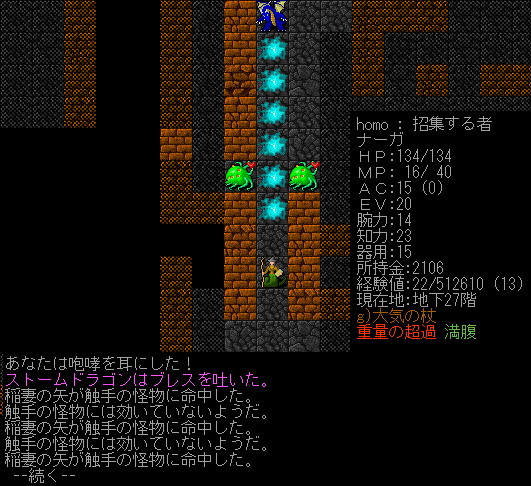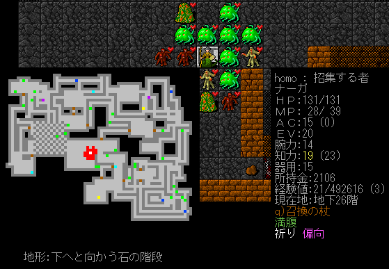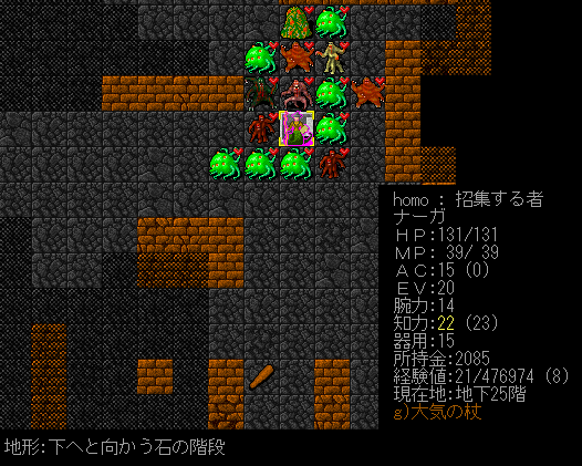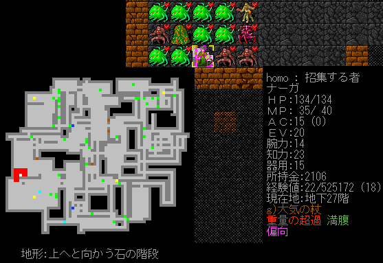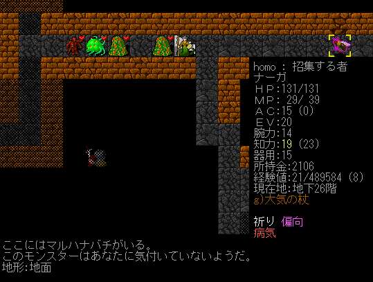 Dungeon Crawlのプレイ日記を始めます。ナーガ召換術師をプレイ中です。メインダンジョンにて経験値とアイテムを稼いでおります。もうすぐ最深階の地下27階に到達するのかな。まだオレンジ像は出現をしていませんね。それどころか『アドルフ』や『ザッハ』も出ない。