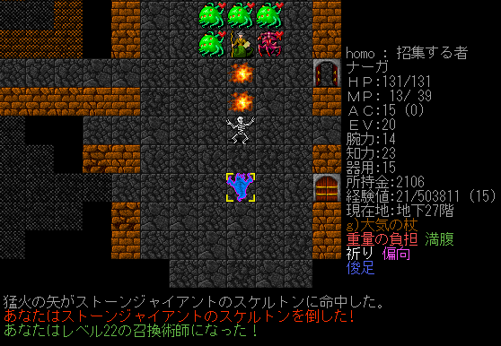 雑魚敵を倒してレベルが22に上がりました。自分はスケルトンに炎が効かないと思い込んでいたんだよね(負傷しているとメッセージが出ないから)。倒せると知ったのは最近です。