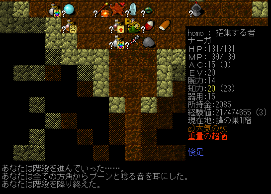厄介なエゴ武器を拾っているから持ち物が重い。テレポートのワンドはいらないだろう。それに武器関係の巻物もいらない。自動拾いに引っかかるアイテムを放置すると不安になるから拾っちゃうんだよな。