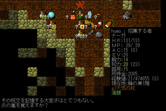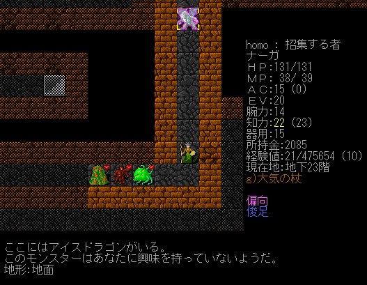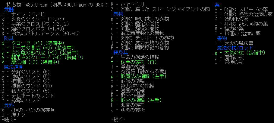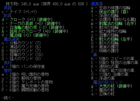 意味の無いアイテムがちらほらあるけど許して下さい(笑)。アーティファクトの護符は耐突然変異の護符です。掠奪のワンドは終盤に活躍しそう。今は凍結のワンドが頼りになります。