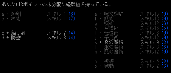 今回は炎の魔術を重点的に育成します。獲得の巻物で火炎の杖を狙っているのです。絶縁を魔法でつけて杖で火炎耐性をつければ貧弱な耐性がマシになるだろう(泣)。