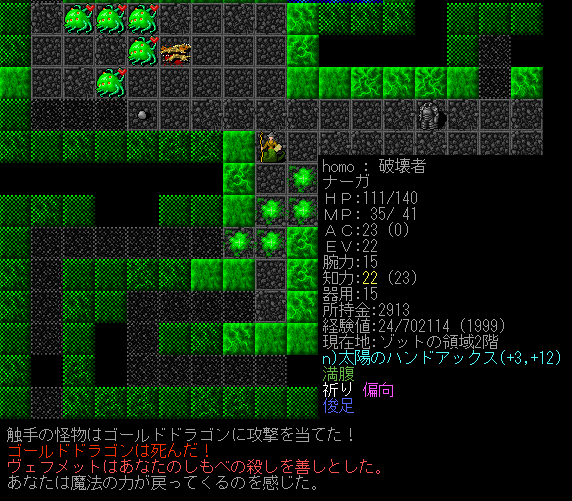 触手達が間に合ってくれてゴールドドラゴンを撃破。ゾットの領域5階のプレイ動画を見ました。ちょっとあれは無理ですね。今からでも妖術を上げるべきか?