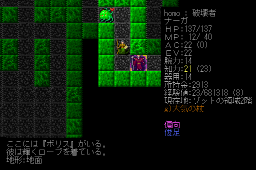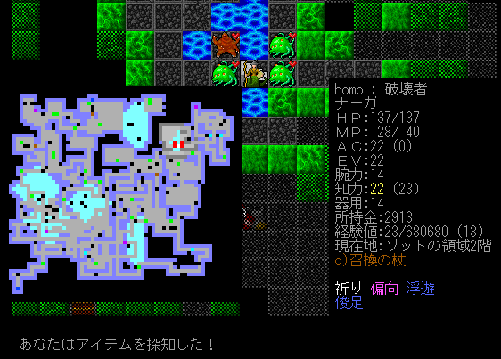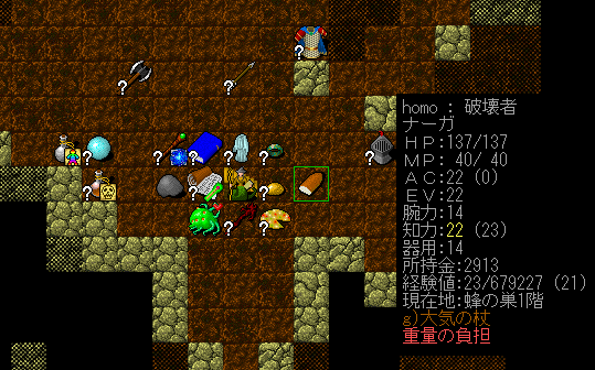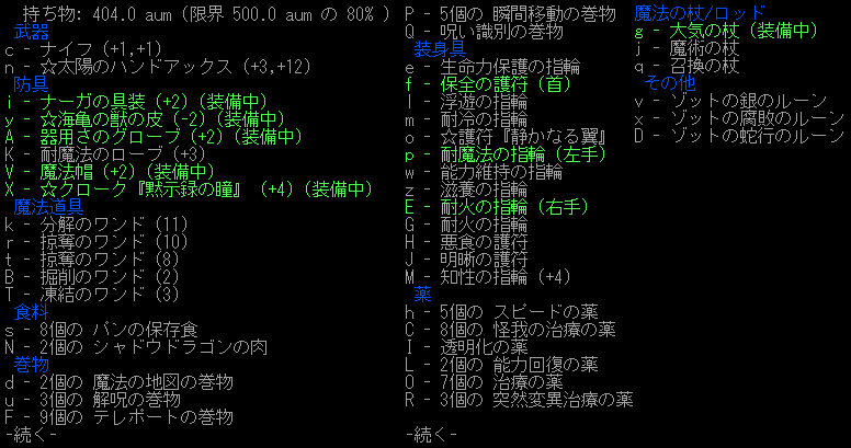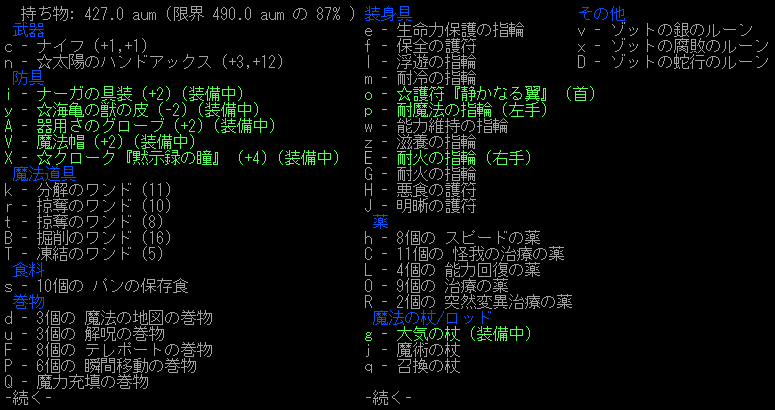 耐魔法のローブは『ボリス』からかっぱらったものです(くさそう)。テレポート制御の指輪を使用したことがないんだけど強いのかな(初心者)。過去ログを見ながら瞬間移動の巻物が販売されている店を探しています。残念ながら発見できず。