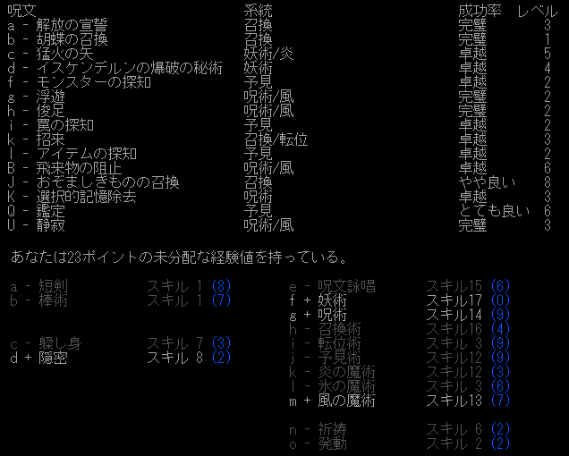 妖術を上げたい。召換術も上げたい。大気の杖なしで飛来物の阻止を唱えるのは無理だと諦めて呪術は抑制をしようか。もう分からない(泣)。