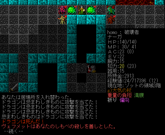 やってしまった。細い通路を歩いて部屋を移動したらドラゴンと隣接しちゃった。俺は下手クソだなあ。まだダメージをくらっていません。召換獣の群れに逃げ込めるか試します。