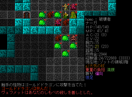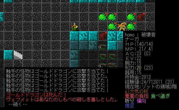 なんとか触手達の影に隠れました。召換獣に命令をしてドラゴンを撃破。これからは狭い通路をワンドで破壊しながら進もうかな。