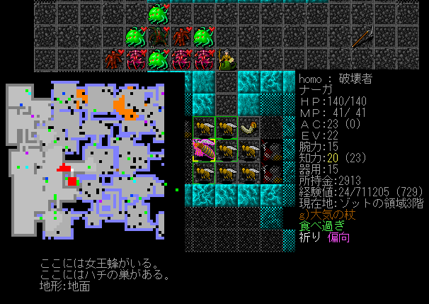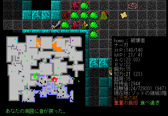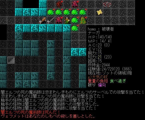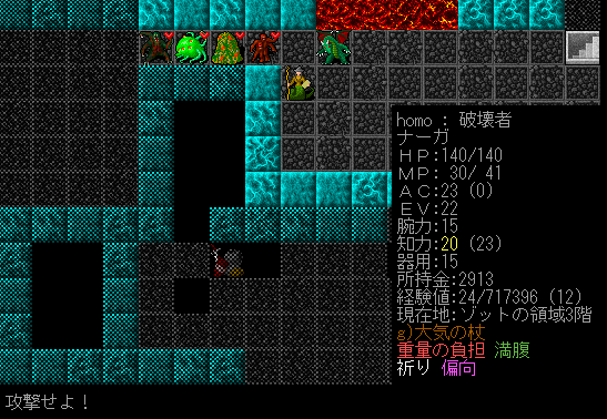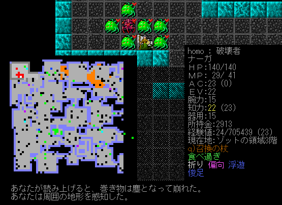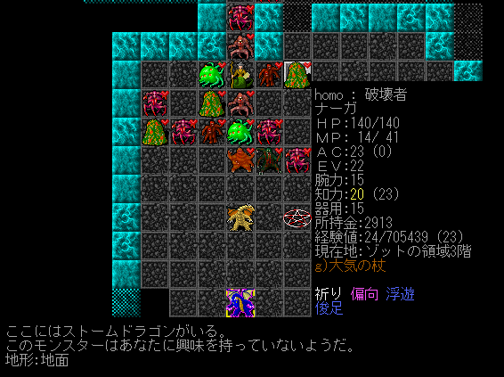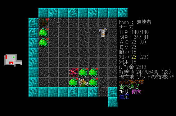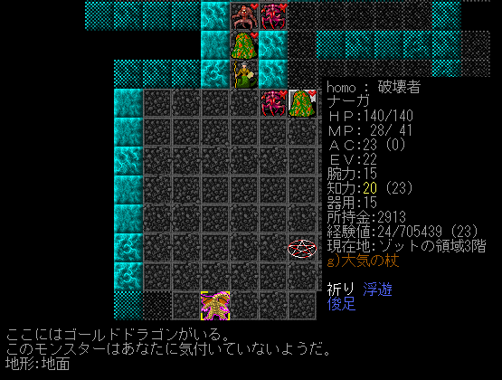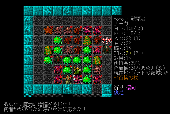 Dungeon Crawlのプレイ日記を始めます。ナーガ召換術師をプレイ中です。ゾットの領域1階の探索が終わりました。キャンプには戻らず2階を攻略します。敵が強いから進攻するペースを落とすことにしました。