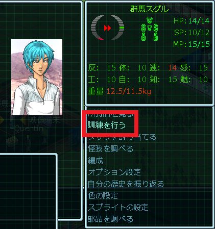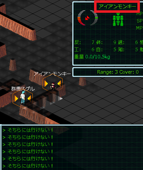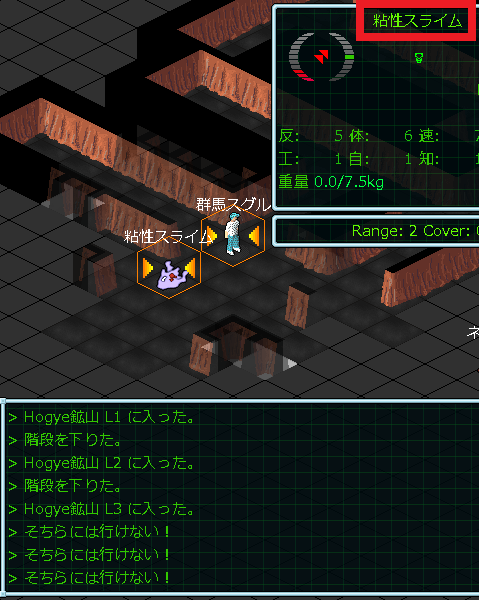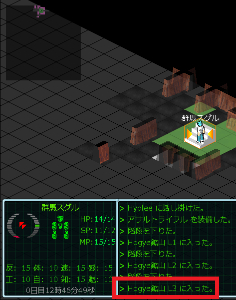 GearHead1のプレイ日記を始めます。前回はHogye鉱山の地下2階を制覇しました。今回の投稿は鉱山の地下3階を攻略します。「速度」が14に下がっているのは所持品の重量がオーバーしているせいです。