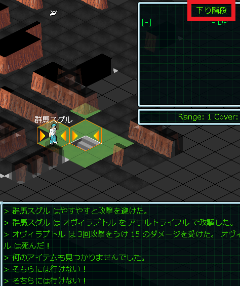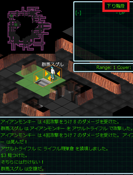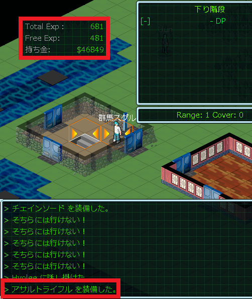 今回の投稿は地下4階も探索してしまおう。というわけで地下3階で発見した下り階段に戻ってきました。雑魚の大群をかいくぐって地下と地上を往復するのはキツい。メックから降りて行動するのはスタミナの管理が難しい。
