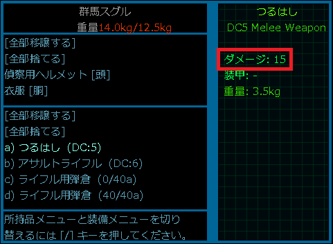 せっかくなので、つるはしの性能を確認してみましょう。つるはしの威力は15であり、実戦で使うには弱すぎる。持ち帰る意味はないので捨てます。