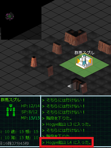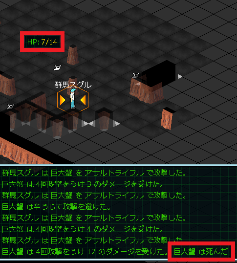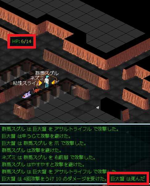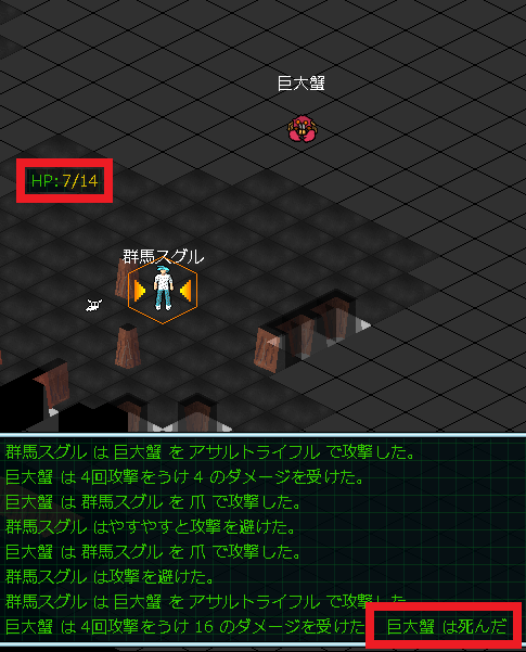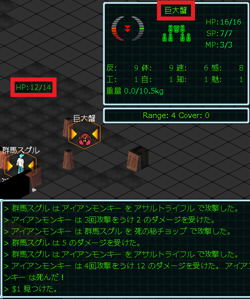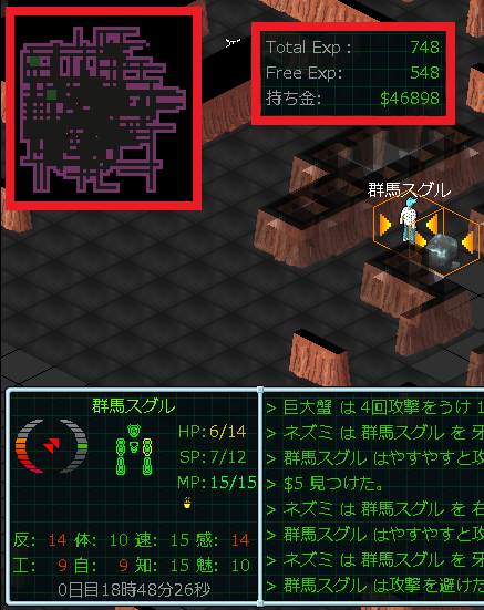 今回の投稿は地下4階を制圧して終了します。現在の能力値は上の画像。巨大蟹の攻撃によりHPが減っているので注意しないといけない。次回は「Z」キーで休憩してからダンジョンに向かいましょう(HPが回復する)。