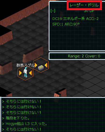 地下4階を歩いていたら「レーザー・ドリル」という名前のアイテムを発見しました。これがwikiに書いてあった地下4階で手に入る収穫です。強い近接戦闘用の武器らしいから性能が楽しみです。