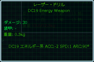 地下4階で拾ったレーザー・ドリルの性能は上の画像。威力が30なのでチェインソードよりも弱い。重量が0.5kgなのは軽くて優秀だと思う。こいつよりも軽い武器は存在しないレベルだろう。メイン武器が銃器の場合に護身用として携帯したい。