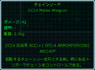 現在持ち歩いているチェインソードの性能と比べてみましょう。チェインソードの威力は42、重量は2.0kgです。俺はアサルトライフルの弾薬が尽きたらこの武器を使用しているのだ。