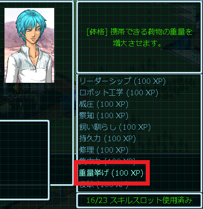 現在所持できるアイテムの上限は11.5kgだ。より多くのアイテムを持ち歩けるようにスキルを習得します。本当はこんな理由でスキルを増やしたくないんだけどね。習得しているスキルが一定数以上まで増えると訓練をするのに多くの経験値が必要になるからだ。