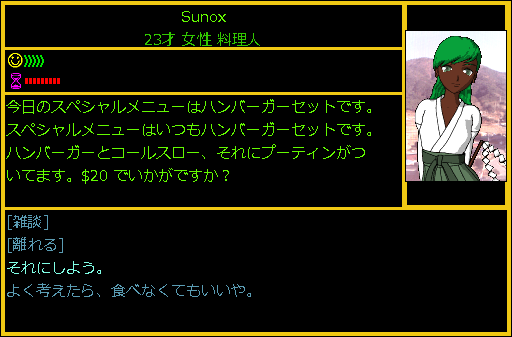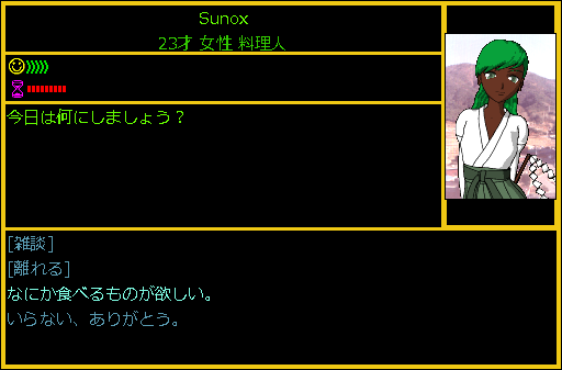 食堂の店主はSunoxという女性だ。髪が緑色の美人です。選択肢から「なにか食べるものが欲しい」を選びます。それ以外の会話は無意味そうだからね。