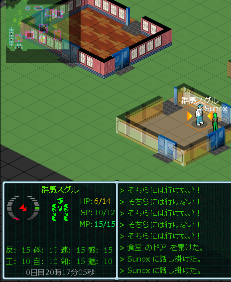 空腹のせいで能力値の低下が酷い。このゲームは餓死をしないので焦らず「食堂」を目指しましょう。食堂では自動販売機の弁当よりも安い値段で食事ができます。