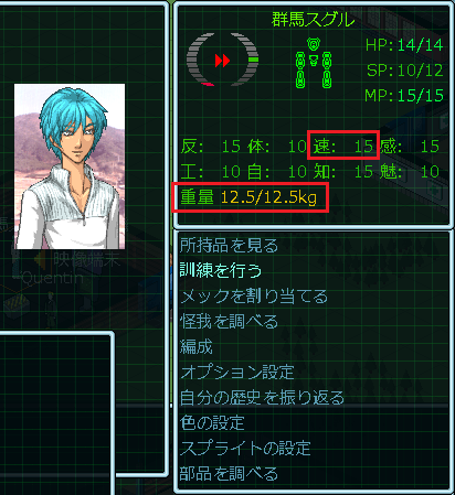 持ち歩けるアイテムの重量が11.5kgから12.5kgに増えました。そして重量オーバーのペナルティが無くなり速度の値が15に戻った。これで心置きなく鉱山の地下5階にあるメックを回収しに行ける。