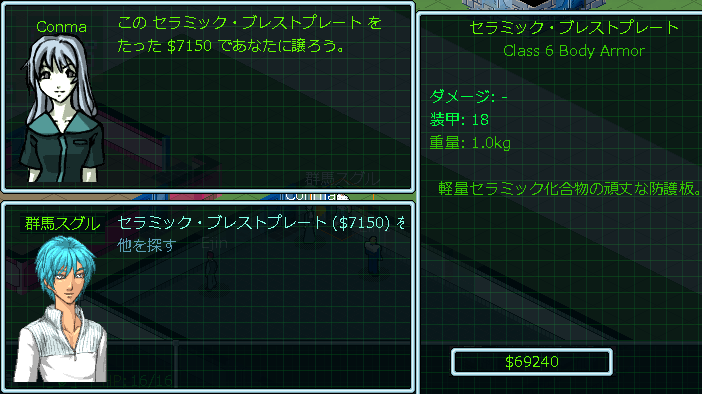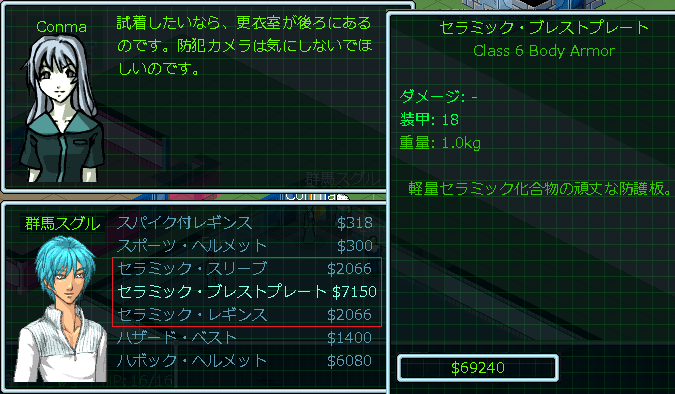 セラミック・ブレストプレートは高額な防具です。まあでも現在の所持品は約7万ドルもあるし躊躇せずに買ってしまおう。金が貯まる一方で使い道に困っていたくらいだしね(笑)。