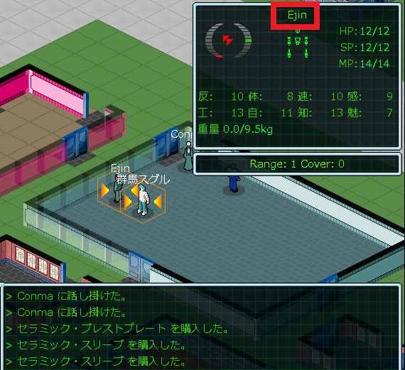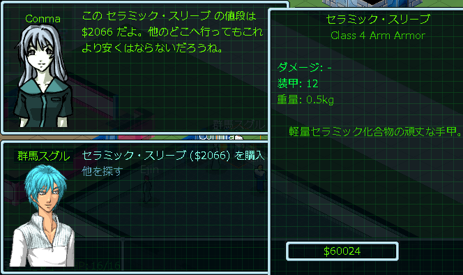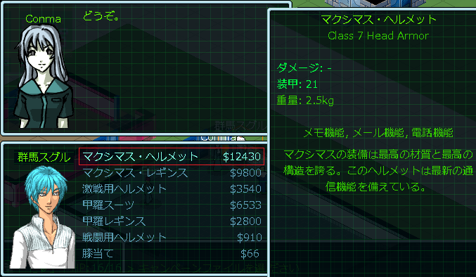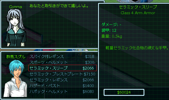 お店の品揃えを核にしたところ、Conmaは防具屋の店主だと判明しました。wikiを見たら序盤の防具はセラミックシリーズ一択だと書いてあった。ゆえに店頭にセラミック防具が並ぶまでリセットとロードを繰り返したのだ。