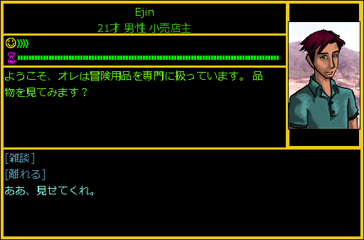 Ejinに話しかけたところ冒険用品の店主だと自己紹介をされました。冒険用品と言われても何のお店なのか見当もつかない。wikiによると冒険用品では「武器・弾薬・盾・PCS・楽器・食料・アドオン」を購入することができるらしい。