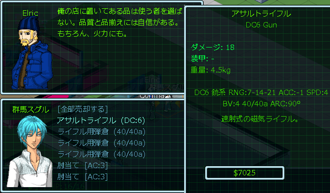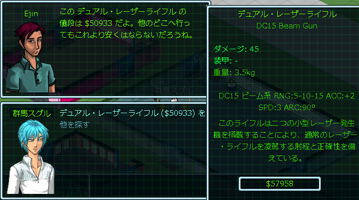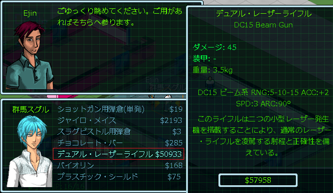 このままアサルトライフルを使っていたら間違いなく殺される。もう高額なレーザー銃を買うしか選択肢はないので有り金を払って購入しました。デュアル・レーザーライフルはDCが15だから重火器です。この銃があれば今後はDCが10以下の小火器は必要なくなる。ゆえにスキルも重火器スキルだけに経験値を集中できて効率が良くなるのだ。