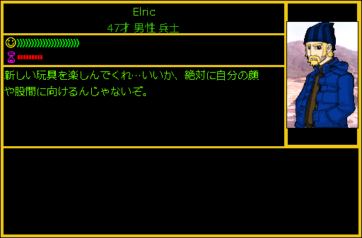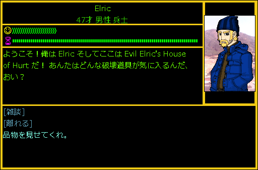 Elricの職業は「兵士」だった。話しかけてみてもどんなお店なのか説明してくれない。もしかしたら兵士のElricが軍から横流しをしたブラックマーケットなのかもね。