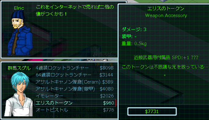 Elricの店の商品は人間用の武器ばかりだった。先ほどデュアル・レーザーライフルを買った冒険用品店と同じだと思っていたら「トークン」という珍しいアイテムを発見しました。「エリスのトークン」はwikiでお勧めされていたので買ってしまおう。