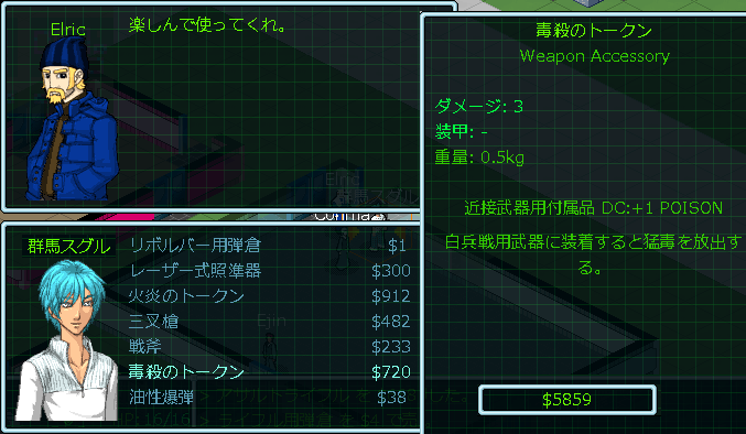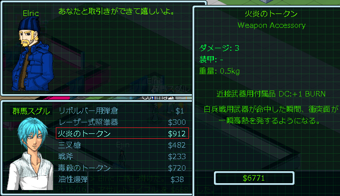 人間用の武器はもう間に合っている。必要なものは無いから無駄遣いを控えたい。そんなことを考えていたら「火炎のトークン」というアイテムを発見した。他にめぼしいアイテムは無いしトークンを買いまくって実験しようか。未知のアイテムを活用してゲームのシステムを理解するのは重要だ。
