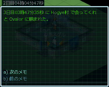 メモを確認したところ「3日目03時47分35秒にHogye村に行きなさい」と書かれていました。あと約23時間後にHogye村に行くとバトルが始まるわけか。それまでに搭乗メックをBuruBuruから斉の襄公に変更しておかないとなあ。俺が乗っているBuruBuruは弱すぎるから、このままだと絶対に敗北する。