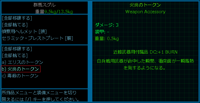 今回の投稿はトークンの使い方を覚えて終わりにしようか。wikiによるとトークンは人間が装備する近接戦闘用の武器に取り付けるアイテムらしい。トークンを活用すると近接武器の性能が向上するのだ。試しに火炎のトークンを使用してみようか。所持品から火炎のトークンを選んで装備するを選びます。
