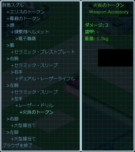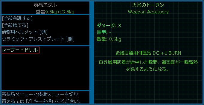 火炎のトークンにカーソルを合わせて装備するを選択したところ、レーザードリルが表示されました(上の画像)。ゲーム画面にレーザー・ドリルが表示された理由は現在の俺が装備している近接武器だからだろう。レーザー・ドリルにカーソルを合わせてEnterキーを押します。