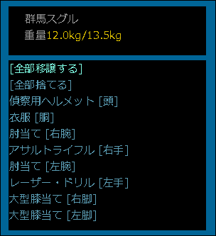 もう少し見やすい画面で装備品を確認してみます。右手に遠距離用の「アサルトライフル」を装備しているのか。そして左手に近接攻撃用の「レーザー・ドリル」を装備している。お店の品揃えに武器があるようなら購入を検討しても良いね。
