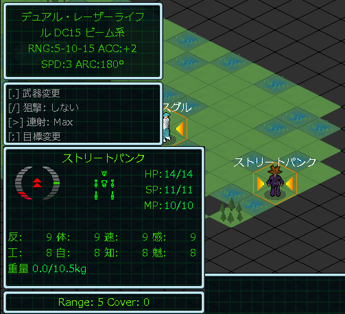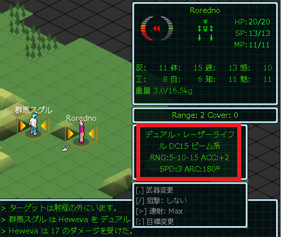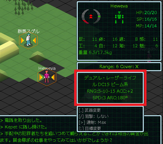 少しばかり右側に移動をしたらHewevaという名のNPCと出会いました。こいつが手配中の犯罪者なんだよな。敵との距離は6だから射撃で攻撃をしよう。さっそく前回の投稿で買ったデュアル・レーザーライフルをぶっ放すぜ。