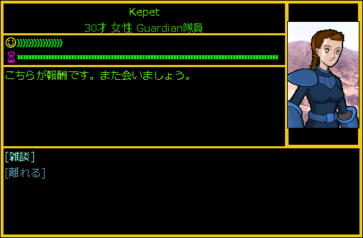 イベントの報酬は街に戻ったあと依頼者と会話をしなければ貰えません。そんなわけで依頼者のKepetに話しかけたときの俺は上の画像。特別な会話は無く短い挨拶が表示されて終わった。汎用イベントはメインストーリーとは関係ないから会話が簡素なものになっているね。
