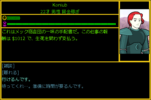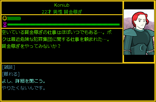 Koniubの話によると空いている仕事はいつでもあるそうです。会話の文章を見るに、犯罪集団に関係する仕事を引き受けることができるのかな?どんな仕事があるのか詳細を聞いてみましょう。