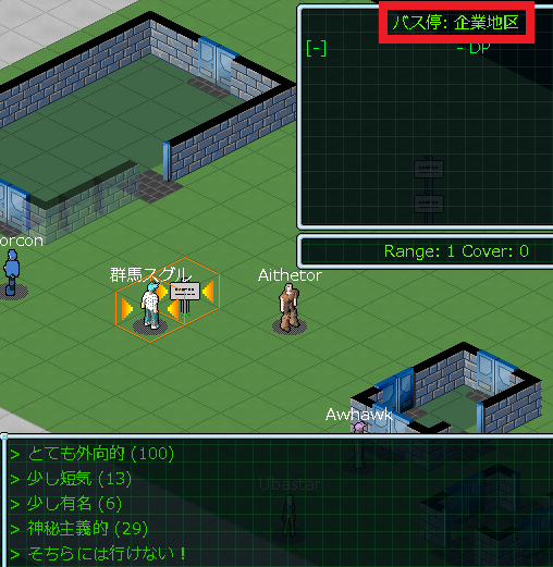 NPCと会話をするのは楽しい。また汎用イベントでお金を稼ぎたいけど、そろそろバスに乗って企業地区に行くことにします。街にあるバス亭を利用するのは今回が初めてだと思われる。