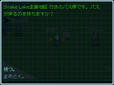 プレイヤーをバス亭に移動させると上の画像が表示されます。ここで「待つ」を選択するとSnake Lake企業地区へ移動できるのです。Snake Lakeは「繁華街、企業地区、ウォーターフロント、公園」と4つに分かれている。それぞれが独立した街みたいなものです。