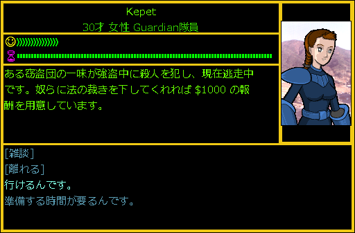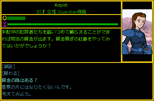 街を歩いて何人かのNPCと再度会話をしました。そしたらKepetというガーディアン隊員が依頼を頼み込んできやがった。依頼の内容は手配中の犯罪者を捕えるというものだ。現在の俺は所持金が減りすぎて困っている。報酬としてお金を貰えないか聞いてみよう。