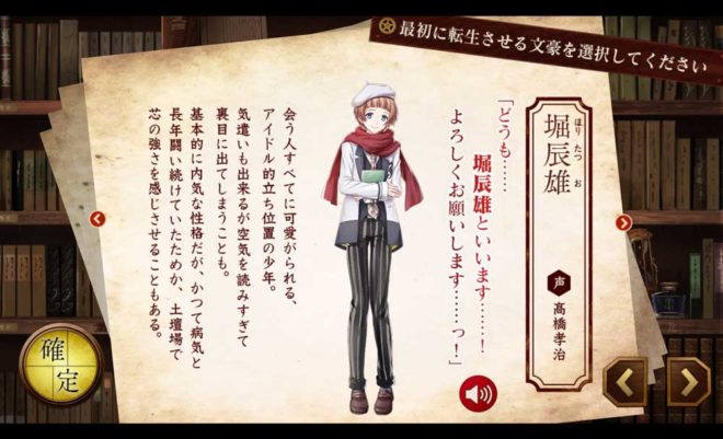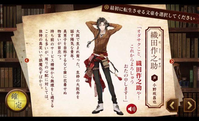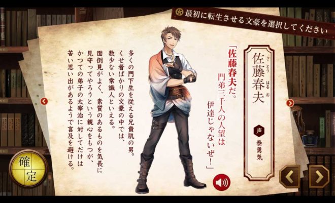 これは?何人かの文豪から選択できるようだ。まだチュートリアルだったのね。この織田作之助という文豪は陽気な青年らしい。秋声は物静かな性格だから織田くんを加入させればバランスは良いかもしれない。