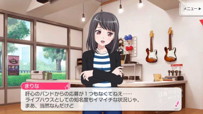 主人公の働くライブハウスではガールズバンドを応援しているらしい。だんだんゲームの内容が分かってきたぞ?主人公はガールズバンドを芸能界にプロデュースする・・・いや、違うよな。会話を見るに主人公は一般人だ。