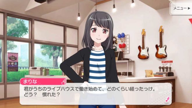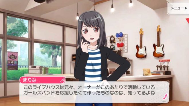 おや?楽器の並んだお店が表示されたでござる(上の図)。まりなさんという女性が働いているみたい。